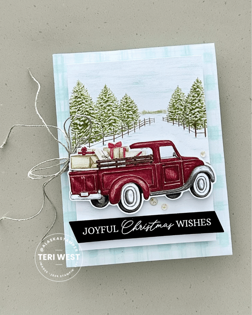 My card features the Road to Christmas Kit. I used mostly elements from the kit, but also added the following products: Pool Party 8 1/2” x 11” Cardstock and White Willow 12” x 12” Cardstock. The card was embellished with Linen Thread, Strawberry Slush & Pretty In Pink Gems, and some Wink of Stella to add some shimmer to the trees. My color palette includes colors from the kit pieces; Basic Black, Crumb Cake, Crushed Curry, Mossy Meadow, Old Olive, Pecan Pie, Pool Party, Real Red, Cherry Cobbler, and White Willow.
