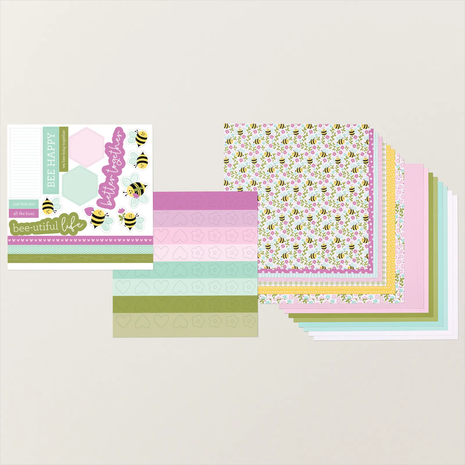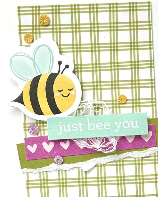 For this project I used only the Meant To Bee Scrapbooking Workshop Kit and a couple embellishments; white twine and the Starburst Sequins. The kit includes two sided cardstock, patterned paper, and sticker sheets. My color palette is Old Olive, Petunia Pop, Pool Party, and Daffodil Delight.