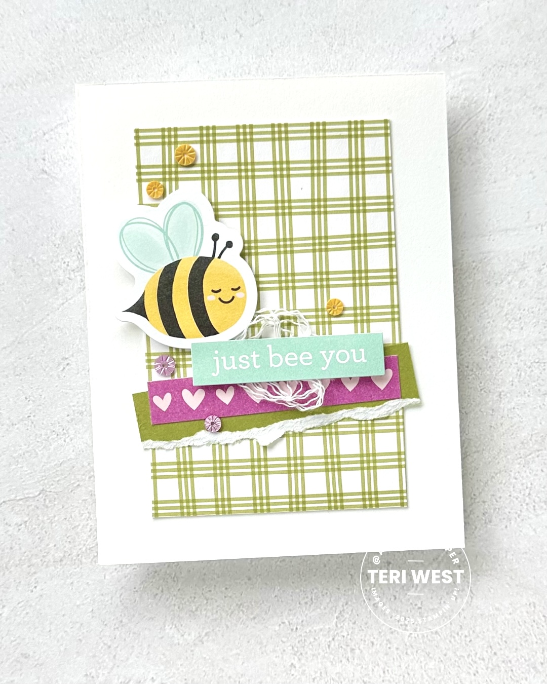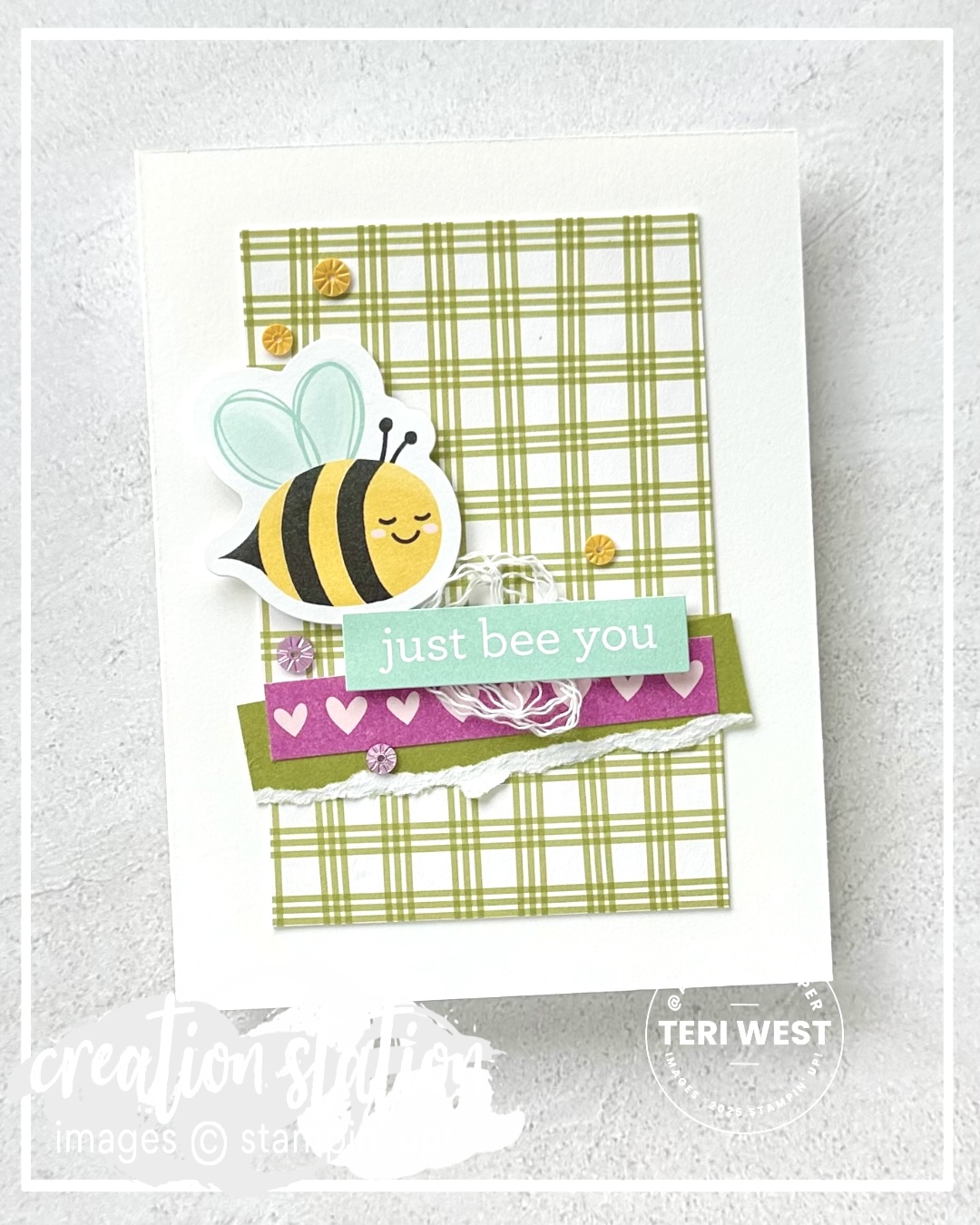 The sentiment, the strip of hearts, and the bee are also stickers found on the sticker page of the scrapbook workshop kit. I removed the tackiness from the back of the bee sticker using an Embossing Buddy from the Embossing Additions Tool Kit, then I adhered it to the card front using Stampin’ Dimensionals. I left the tackiness on the sentiment and the strips of hearts. The white twine was separated and shaped into a nest then attached to the back of the tacky sentiment. The strip of hearts was adhered directly to the Old Olive Two-Tone Cardstock torn strip
