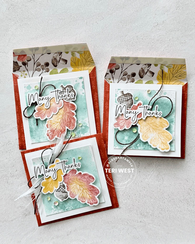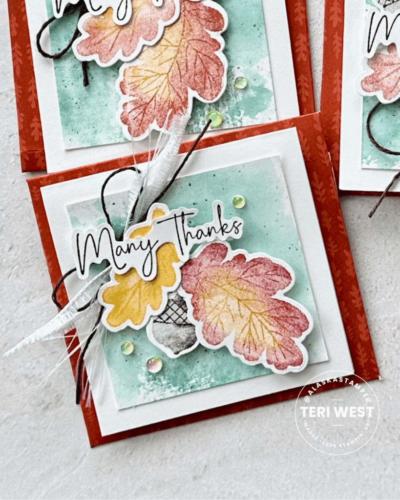 I used a couple coloring techniques to create my background and leaves.  The background on the mat layer was made by “smooshing” a piece of Basic White Thick cardstock onto a clear block with watered down Lost Lagoon Ink, then I added flecks of Lost Lagoon ink from a Stampin’ Write Marker. To make the leaves, I inked the image with the lightest color first and then adding the darker color with a sponge dauber before stamping onto Basic White cardstock.