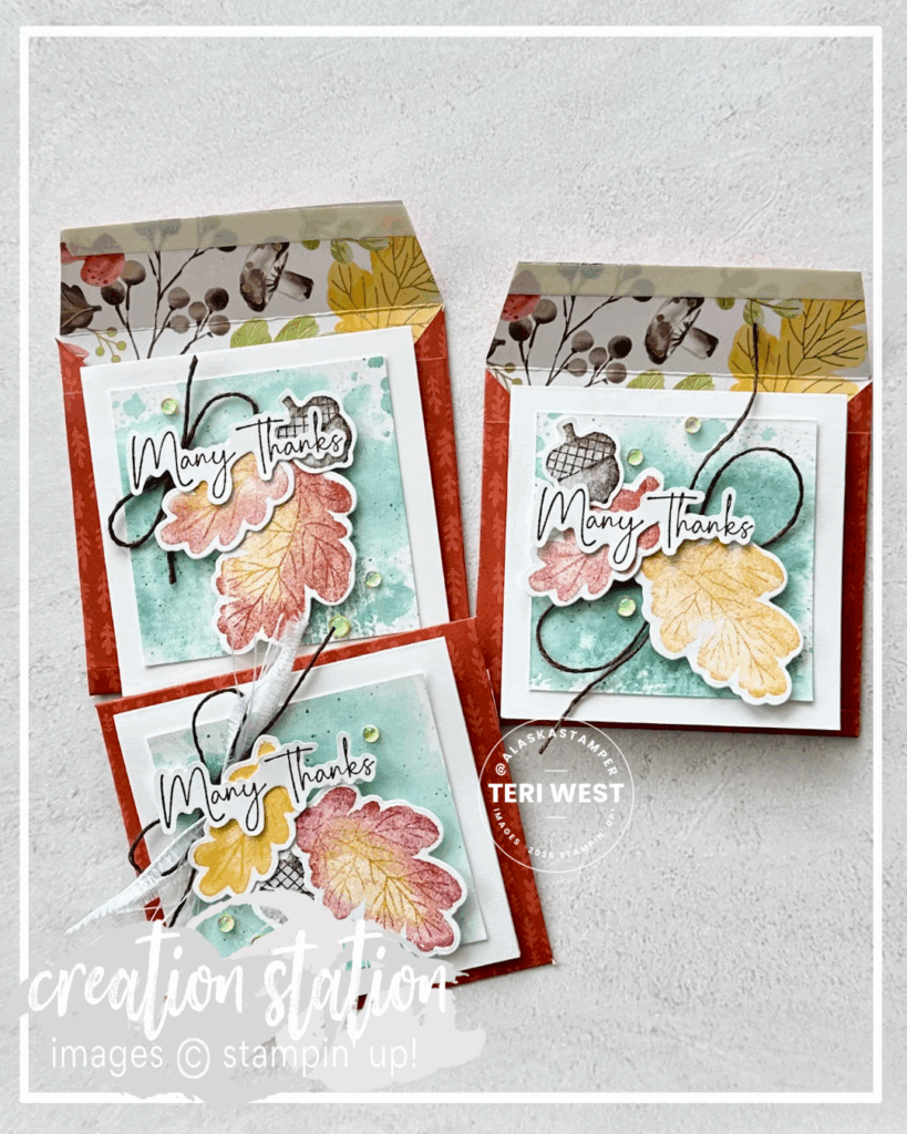 The envelopes were handmade using the beautiful Specialty DSP. First cut a piece of DSP at 4-1/2” x 7”, then score as follows: score on long side: 1”, 4-1/4”, score on short side: 1/2”, 4”, cut out scored sections on all corners. Use a corner rounder on all corners or cut 1/4” to inside corner angles on flap and 1/2” to inside corner angles on the top of the inside flaps that will be tucked in and covered by envelope front piece.