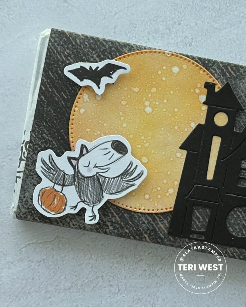 My moon was created by cutting a circle with the Stylish Shapes Dies from Basic White Cardstock. I used a blender brush to apply color to the circle piece, first Crushed Curry covering the circle and then added some Cajun Craze around the edges and in a few spots towards the center. To create the crater look on the moon, I used a Water Painter to add droplets of water over the inked circle piece and let it dry.